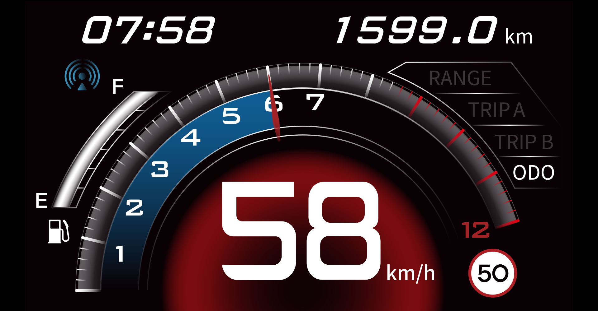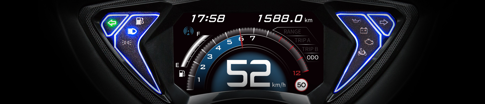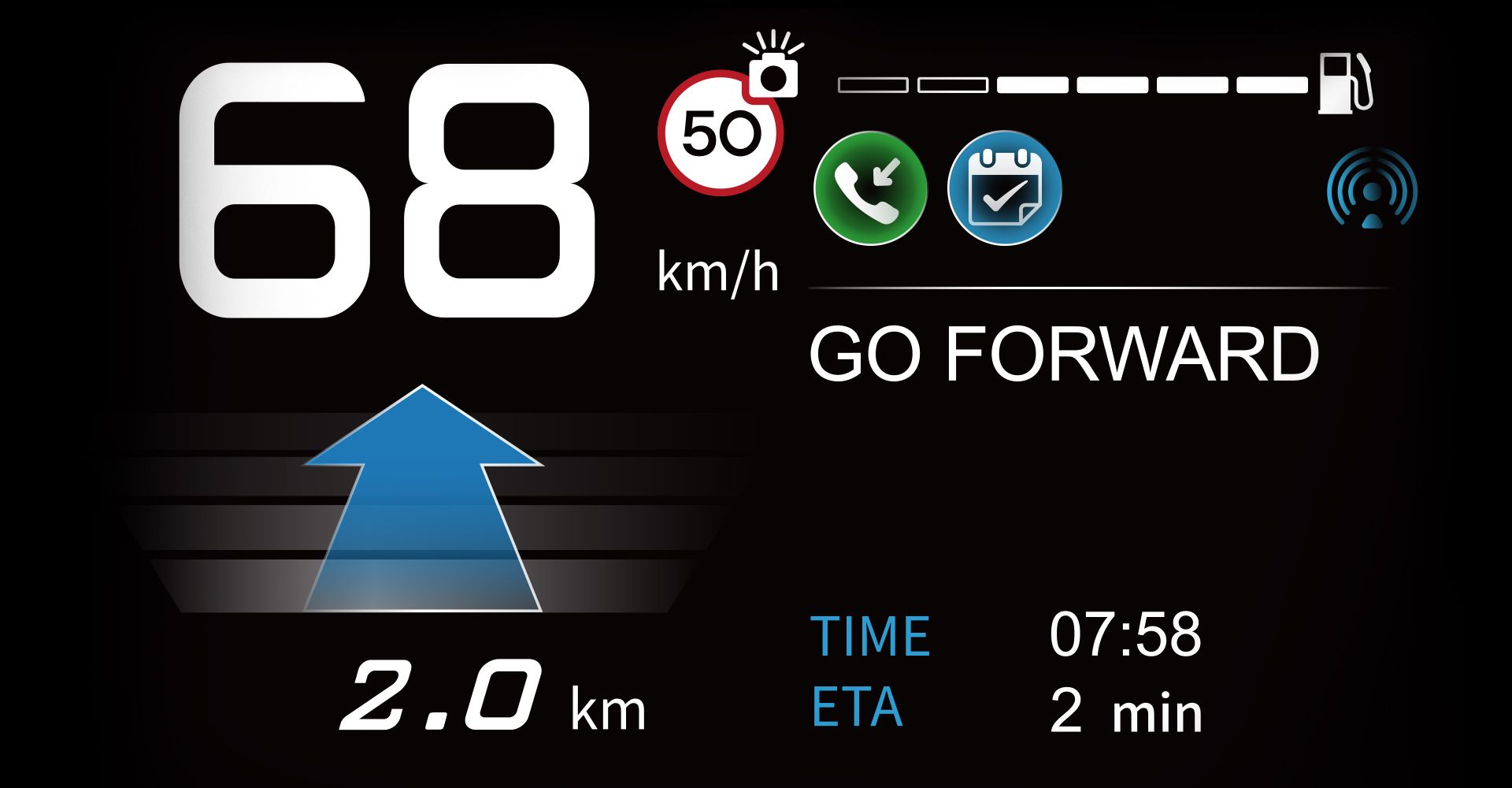 全新設計之數位儀表,隨著時速產生顏色變化 並提供當前速限警示 也同時具備來電及行事曆通知之功能